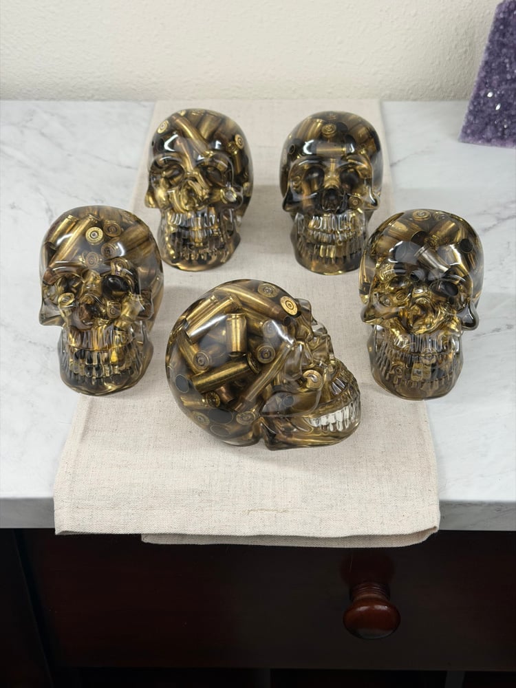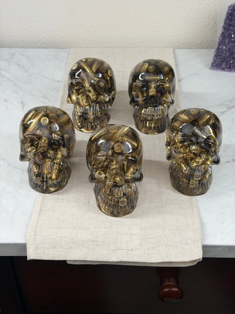 These 4" skulls are full of real recycled bullet shell casings, sizes range from 9mm up to .223 with either a clear base or a black base.